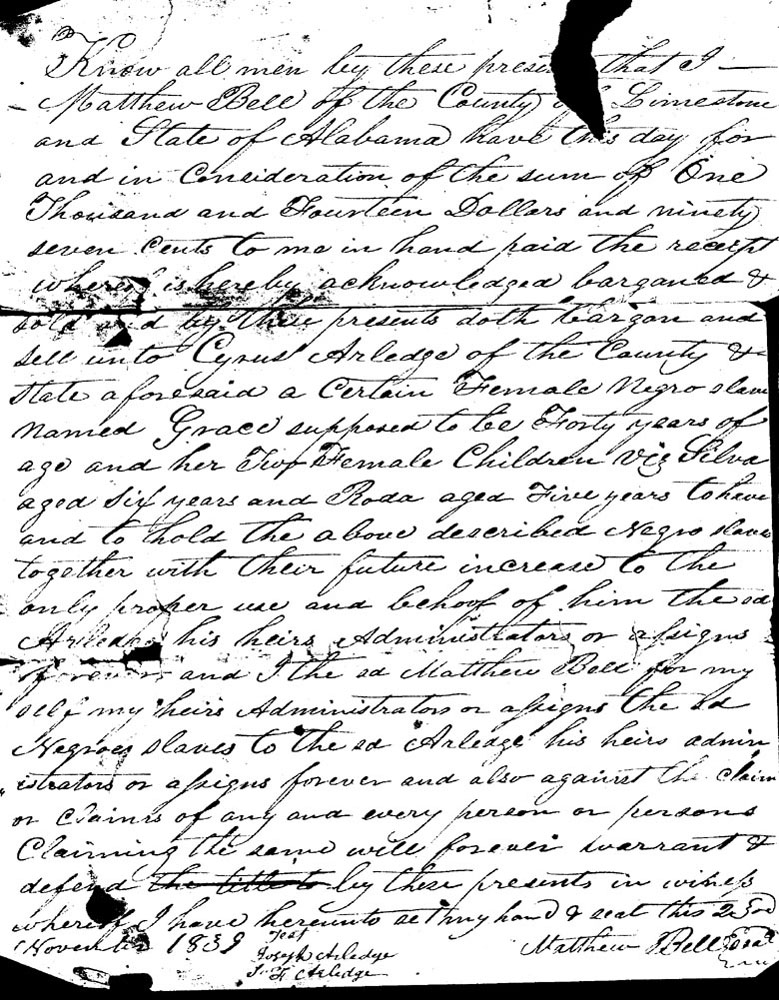 Know all men by these presents that I -- Matthew Bell of the County of Limestone and State of Alabama have this day for and in consideration of the sum of One Thousand and Fourteen Dollars and ninety seven cents to me in hand paid the receipt whereof is hereby acknowledged barganed & sold and by these presents doth bargan and sell unto Cyrus Arledge of the County & State a foresaid a certain Female Negro slave named Grace supposed to be Forty years of age and her Two Female Children vis. Silva aged six years and Roda aged Five years to have and to hold the above described Negro slaves together with their future increase to the only proper use and behoof of him the sd. Arledge his heirs Administrators or assigns forever and I the sd. Matthew Bell for my self heirs Administrators or assigns the sd. Negroe slaves to the sd. Arledge his heirs administrators or assigns forever and also against the claim or claims of any and every person or persons claiming the same will forever warrant & defend by these presents in witness whereof, I have hereunto set my hand & seal this 23rd November 1839. Matthew Bell (seal) Test: Joseph Arledge J.F. Arledge