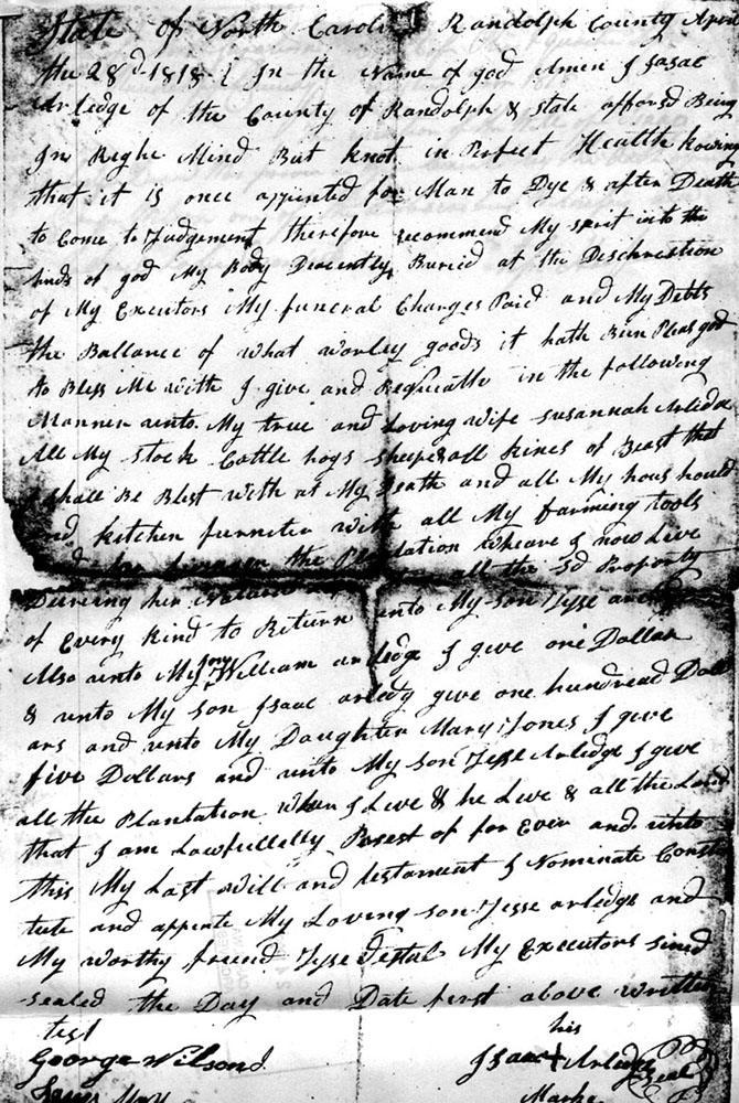 Will of ISAAC ARLEDGE of Randolph Co, NC